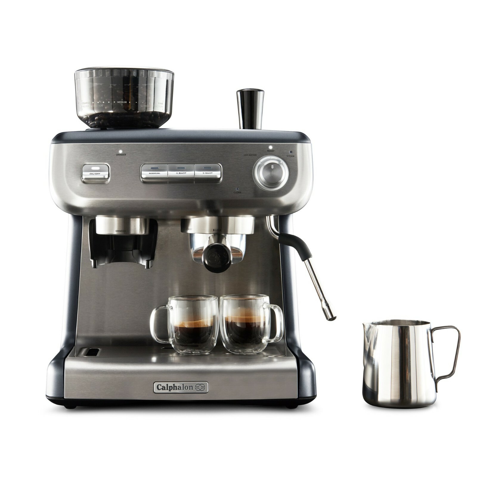 Integrated conical burr mill grinder features 30 adjustable grind settings for fresh espresso with every use. Calphalon BVCLECMP1 Temp iQ Espresso Machine with Steam Wand Stainless Steel. The Calphalon Temp iQ Espresso Machine with Grinder uses precise grinding and evenly heating for great tasting espresso.